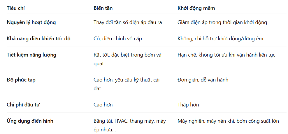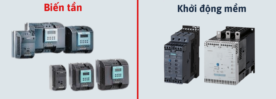 Khởi động mềm: phù hợp cho các tải có quán tính lớn, chỉ cần khởi động/dừng êm, không cần điều chỉnh tốc độ. Ví dụ: máy nghiền, máy nén khí, bơm công nghiệp lớn.
